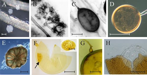 Some characteristic morphological features of fungi belonging to the subphylum Glomeromycotina. A, roots of Plantago media colonised with hyphae and spores of Glomus clarum. B, arbuscule of Glomus mosseae stained with chlorazol black. C, Vesicle of Glomus mosseae. D, Spore of Glomus sp. showing the hyphal attachment. E, Section of a sporocarp of Glomus sinuosum with spores grouped around a hyphal plexus and covered by a layer of hyphae. F, Spore of Scutellospora cerradensis, showing bulbous sporogenous cell and inner flexible walls with germination shield (arrow); inset: germination shield of S. scutata in face view (photomicrographs by Fritz Oehl, Agroscope Reckenholz-Tänikon, Switzerland). G, Germinating spore of Gigaspora decipiens with sporogenous cell, warty germination layer and germination hypha. H. Spore of Acaulospora denticulata with tooth-like wall ornamentations and inner germinal walls. Scale bars = 100 µm (A, E, F, G), 50 µm (D, H), 5 µm (B, C). Modified from Redecker & Raab, 2006 using graphic files kindly supplied by Prof. Dirk Redecker, Université de Bourgogne, France. Reprinted with permission from Mycologia. © The Mycological Society of America. |