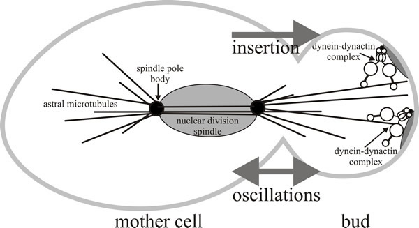 In budding yeast, the SPB is embedded in the nuclear envelope, where it serves as the origin for spindle microtubules from its inner ‘spindle plaque’ and cytoplasmic (called astral) microtubules from its outer plaque. Astral microtubules and motors, together with the actin cytoskeleton and additional cell-polarity determinants act to control nuclear movements into and through the neck of buds (Fig. 10). Two major nuclear movements occur during yeast budding: alignment of the nucleus along the mother-to-bud axis and near the neck of the bud, and then the post-anaphase propulsion of the daughter nucleus through the neck and into the bud. The model shown in Fig. 10 suggests that the Kip3 kinesin positions the dividing nucleus near the bud neck, while dynein is responsible for inserting the nucleus through the bud neck during anaphase, and also causes the oscillatory movements of the nucleus observed during nuclear insertion.