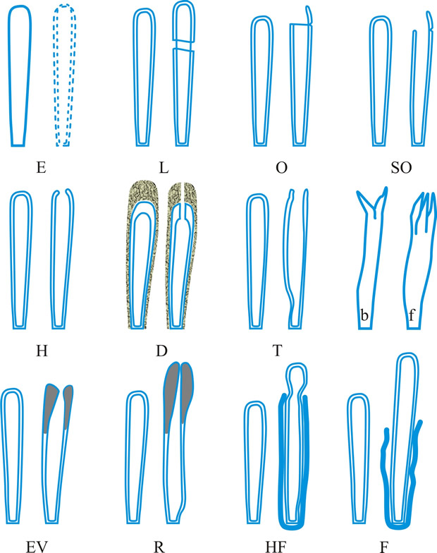 Fig. 21. Hyphidia. A, setal hypha ( Phellinus); B, seta ( Inonotus); C, asteroseta ( Asterostroma); D, gloeo-hypha ( Gloeocystidiellum); E, encrusted ( Peniophora); ...continued... |