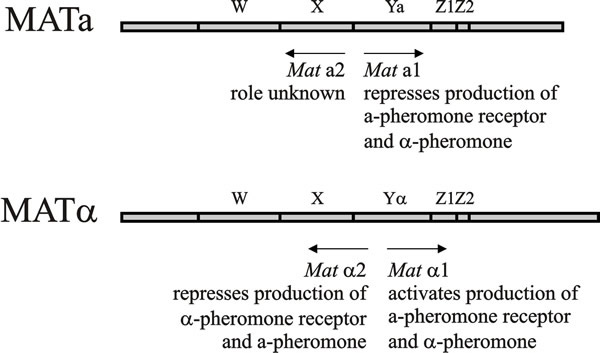In Saccharomyces cerevisiae a relatively small region of the genome, less than a thousand base pairs, codes for a complex genetic locus called MAT. The MAT locus lies in the middle of the right arm of chromosome III, about 100 kb from both the centromere and the telomere. The two mating-type alleles, MATα and MATa, differ by about 700 bp of sequences (designated Yα and Ya respectively) that contain the promoters and most of the open reading frames for proteins that regulate many aspects of the cell’s sexual activity (for review, see Haber, 2007). The MAT locus is divided into five regions (called W, X, Y, Z1, and Z2) on the basis of sequences that are shared between MAT and the two unexpressed (cryptic) copies of mating-type sequences that serve as donors during the recombinational process that allows a MATa cell to switch to MATα or vice versa (see Section 8.3 below).