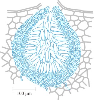 An acervulus (Fig. 11) is a distinct mass of conidiophores that develops just beneath the surface of a host plant and bursts through as the spores mature, pushing aside flaps of host tissue as they emerge. It is rather less structured than a stroma (the name is derived from the Latin acervus, meaning ‘heap’), and is produced by species of the plant pathogen Colletotrichum, cause of anthracnose diseases of citrus, banana, cucumber, and other crops.