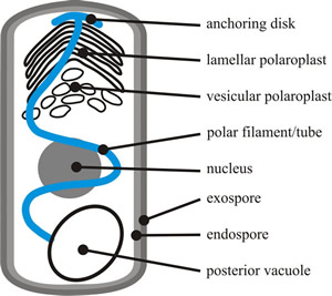 Microsporidian spore morphology typically includes a thick protective outer wall protein and inner wall of chitin and; but its most obvious morphological feature is the polar filament (Keeling & Fast, 2002). This is specialised for host invasion and provides the microsporidian spore with a unique and highly specialised mode of host infection, where the parasite enters its host through a projectile tube that is expelled at high velocity. The polar filament (or polar tube) is a fine hollow tube, which is attached to a plate at one end of the spore, is then coiled within the mature spore, and terminates near the posterior vacuole at the other end of the spore (Fig. 1) ) (Keeling & Fast, 2002; Vávra & Larsson, 2014).