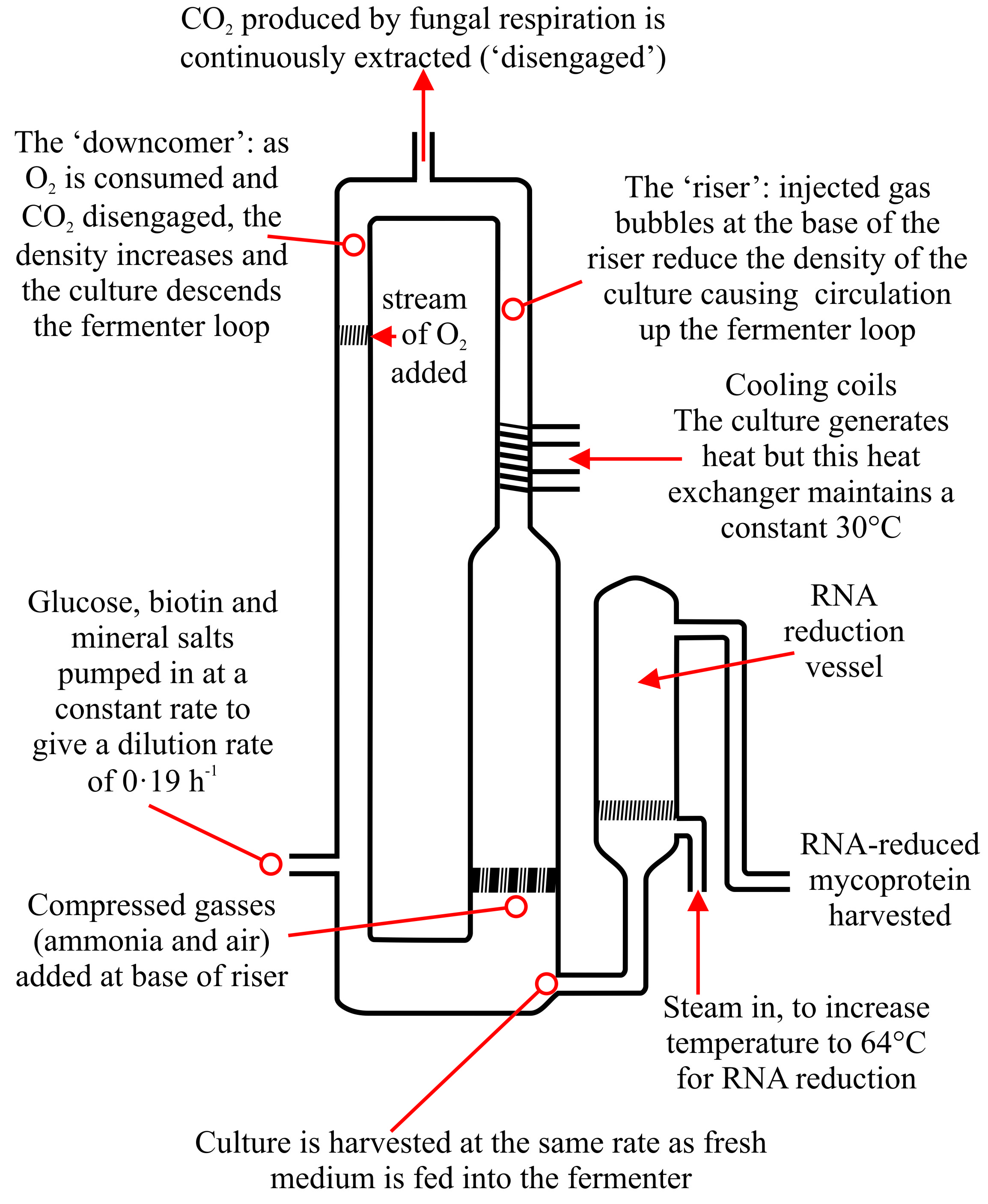 The low pressure region at the top of the riser causes release of CO2 and the culture then enters the downcomer where, at the bottom, it is directed into the riser and is again charged with air thereby completing the pressure cycle. The culture is maintained at about 30°C by a heat exchanger set into the downcomer. To prevent oxygen-limitation, the downcomer is provided with an oxygen supply. The difference in specific gravity of the relatively aerated culture in the riser and the relatively air-depleted culture in the downcomer (creating a hydrostatic pressure differential) ensures that the growing hyphal filaments circulate continuously around the fermenter loop at a rate of about one circulation every 2 minutes for Quorn 2 and 3, compared to every 6 minutes for Quorn 1.