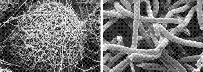 | Fig. 35. Cryo-SEM images of the outer layers of fruit body initials of Pleurotus pulmonarius. Many of the hyphae were alive when flash-frozen and remained fully inflated. Cells undergoing programmed cell death, however, tend to collapse. In the right-hand image a number of the hyphae show abrupt terminations where the hyphal filament has been severed by programmed death of one or more hyphal compartments. Photographs kindly provided by Dr Carmen Sánchez. |