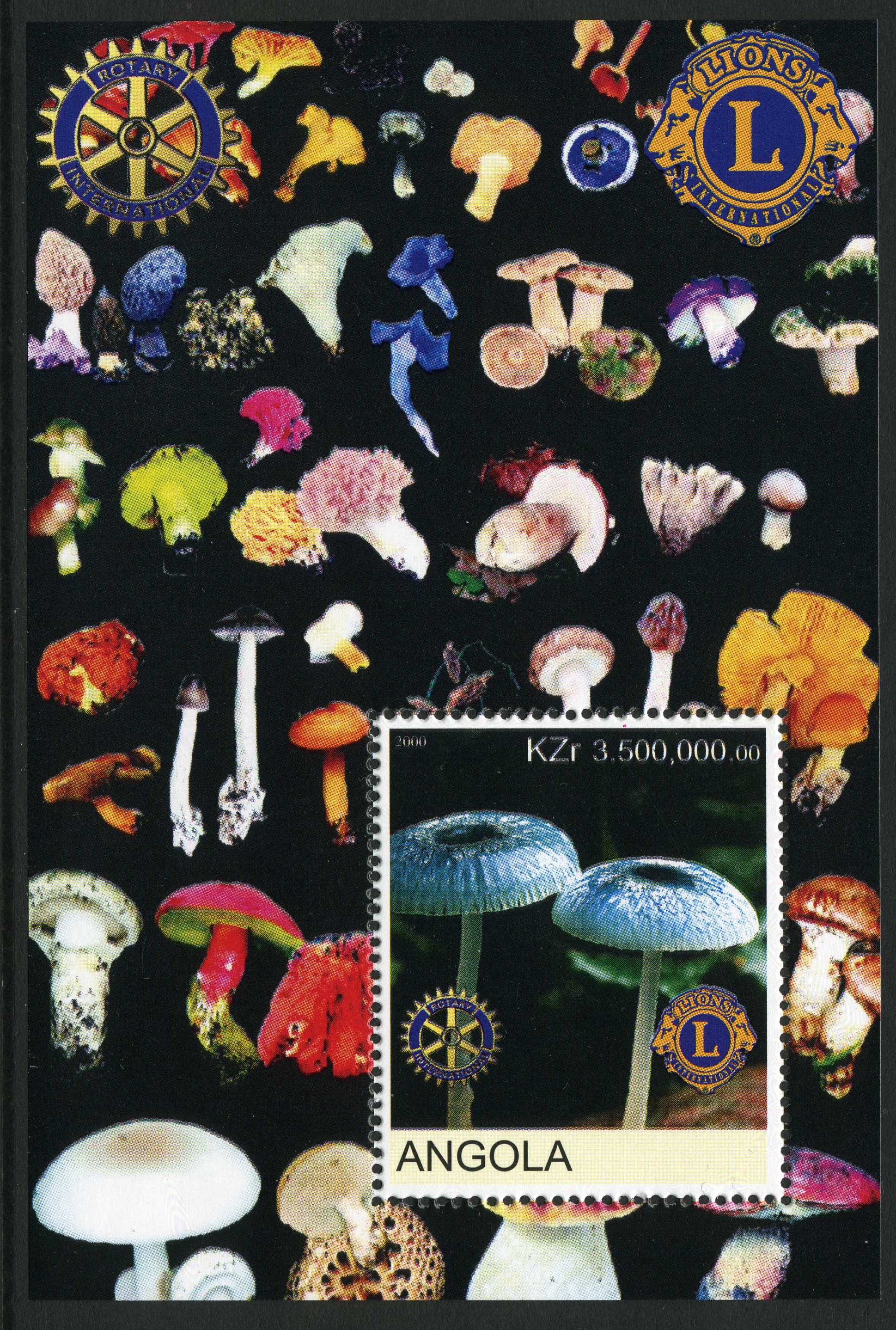 | Angola | 1999 | DM1999 | Separates: 10,000KZr, Aleuria aurantia (PLUS one overprinted in gold 'Hobby Day 1999'); 25,000KZr, Mycena alcalina; 125,000KZr, Sarcodon imbricatum, (PLUS one overprinted in gold 'Hobby Day 1999'); 250,000KZr, Stropharia aeruginosa (PLUS one overprinted in gold 'Hobby Day 1999'). | VIEW |
