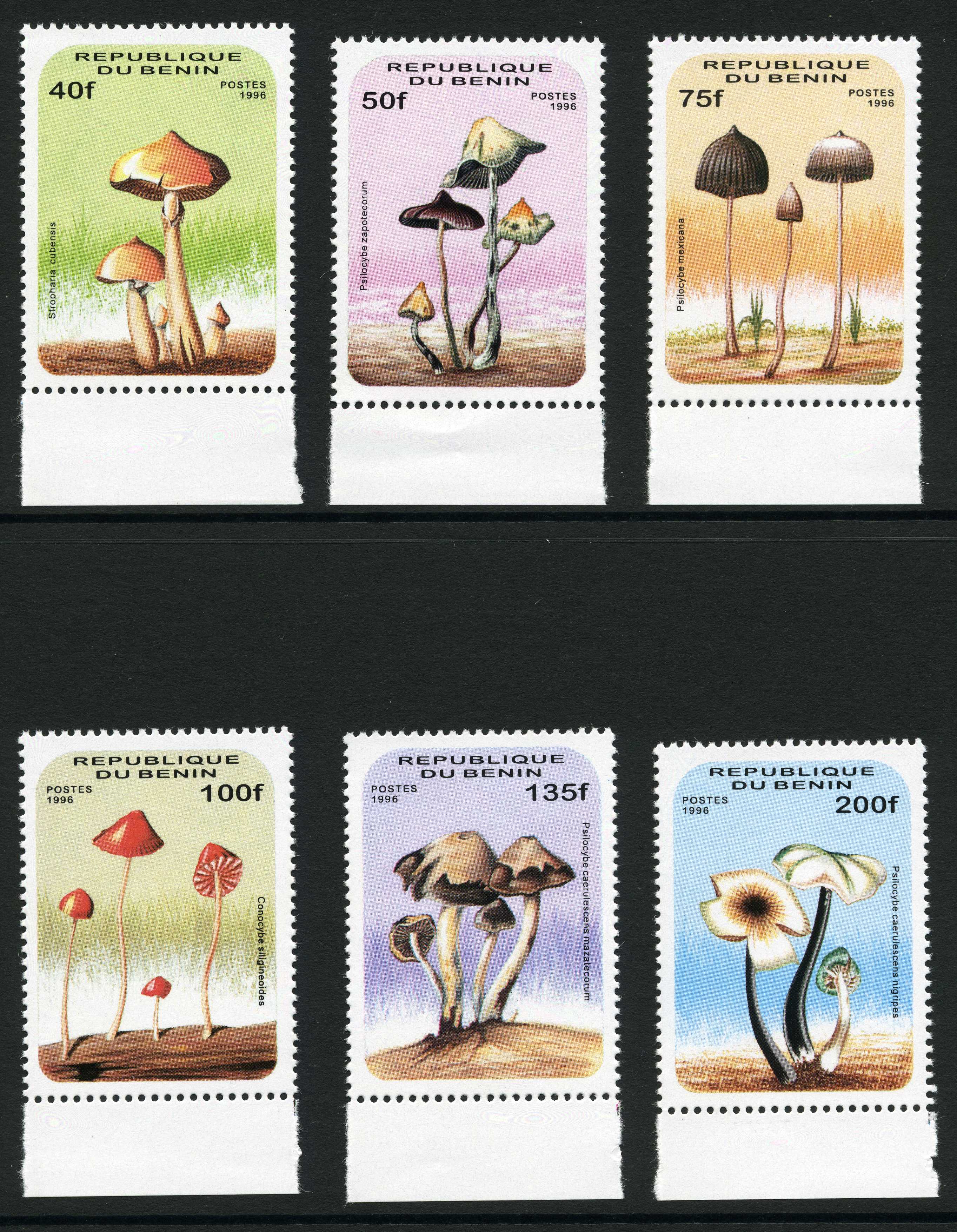 | Benin | 1996 | MS1438 | Minisheet, 93 x 71 mm, 1000f. Psilocybe aztecorum (the stamp is a 39 x 31 mm section of the overall sheet image of 'Champingnons') | VIEW |