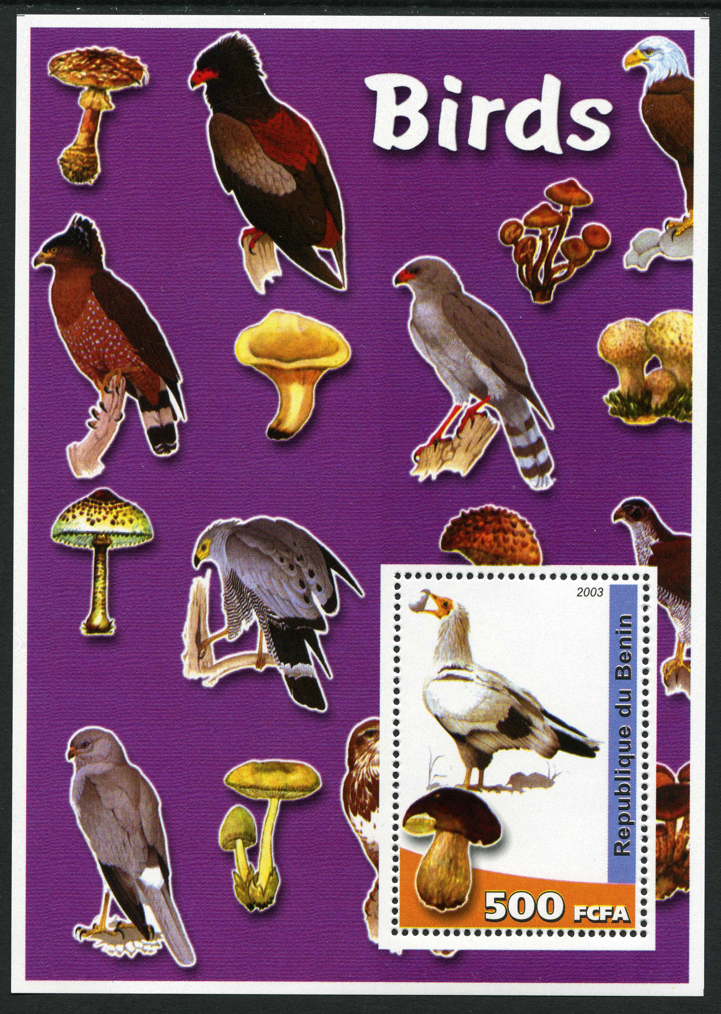 | Benin | 2003 | DM2003 | Souvenir sheet, 147 x 200 mm, nine different stamps of 100 FCFA face value, in a series that features BIRDS, though all stamps have a mushroom occupying the bottom left quarter of the stamp. Neither bird nor mushroom are identified. | VIEW |