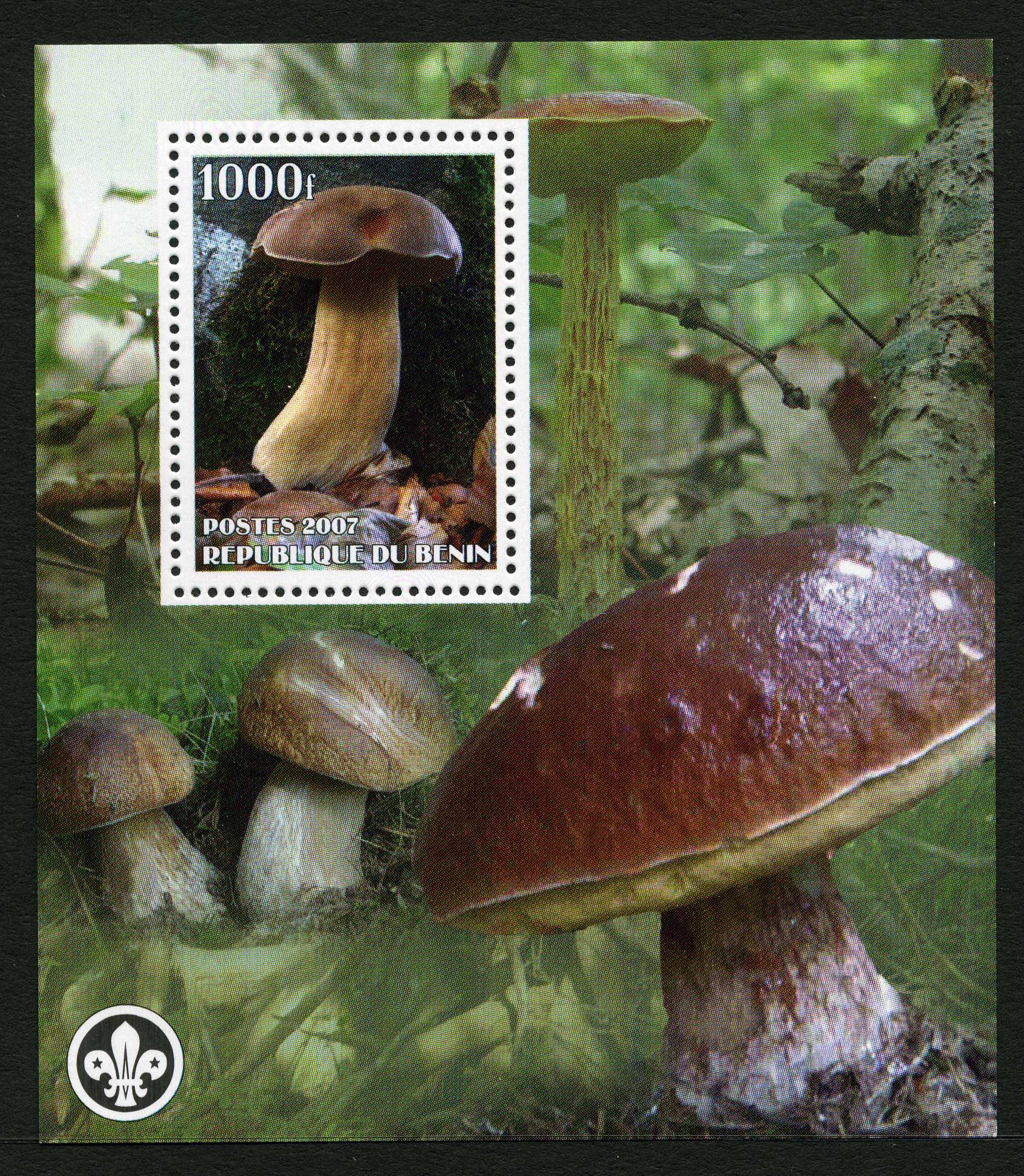 | Benin | 2003 | DM2003 | Minisheet, 100 x 140, in a series that features BIRDS, single stamp, 5000 FCFA face value, with a mushroom occupying the bottom left quarter of the stamp. Neither bird nor mushroom are identified, but the bird and mushroom theme is applied to the minisheet background. | VIEW |
