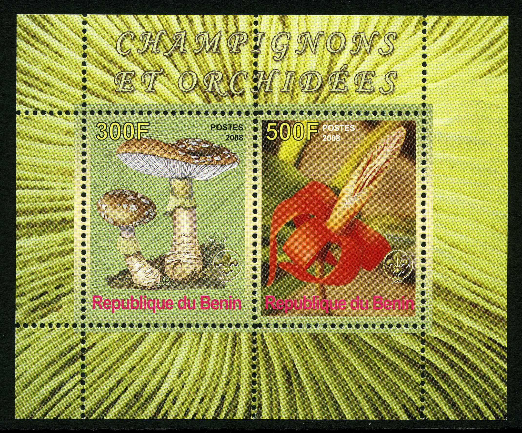 | Benin | 2008 | DM2008 | Minisheets, 86 x 70 mm, each with two stamps from the 'Mushrooms and Orchids' series, mushroom stamps are 300F face value, orchids 500F: (a) Amanita muscaria [VIEW], (b) unidentified bolete [VIEW], (c) Amanita pantherina [VIEW]. | |