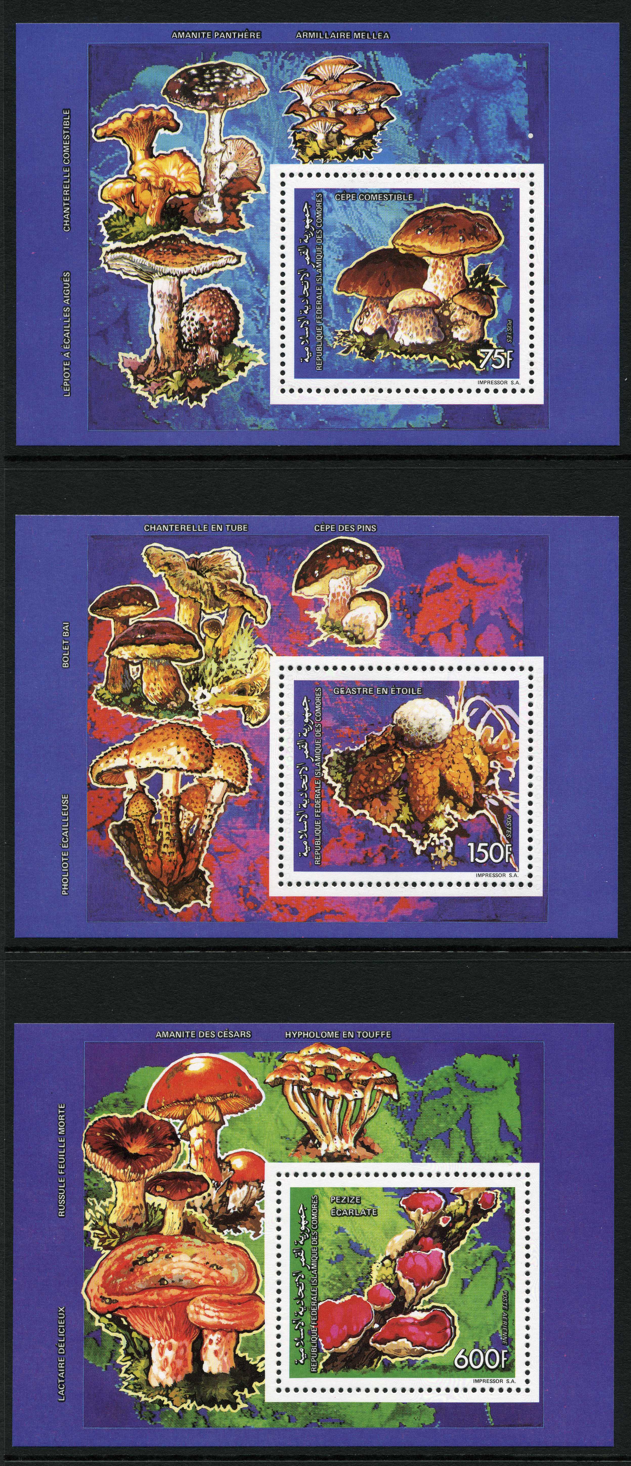 SEPARATES; three stamps all 1350FC face value, perforated; featuring Amanita caesarea, Morchella vulgaris, Amanita muscaria [VIEW]. PLUS same three stamps as separates IMPERFORATE [VIEW]. PLUS same three stamps in a vertical strip in a minisheet, 111 x 129 mm, one version of the sheet perforated [VIEW], another IMPERFORATE [VIEW]. PLUS the same three stamps in single-stamp minisheets, 78 x 82 mm, set of three minisheets perforated PLUS set of three IMPERFORATE [VIEW A], [VIEW B], [VIEW C]. | |