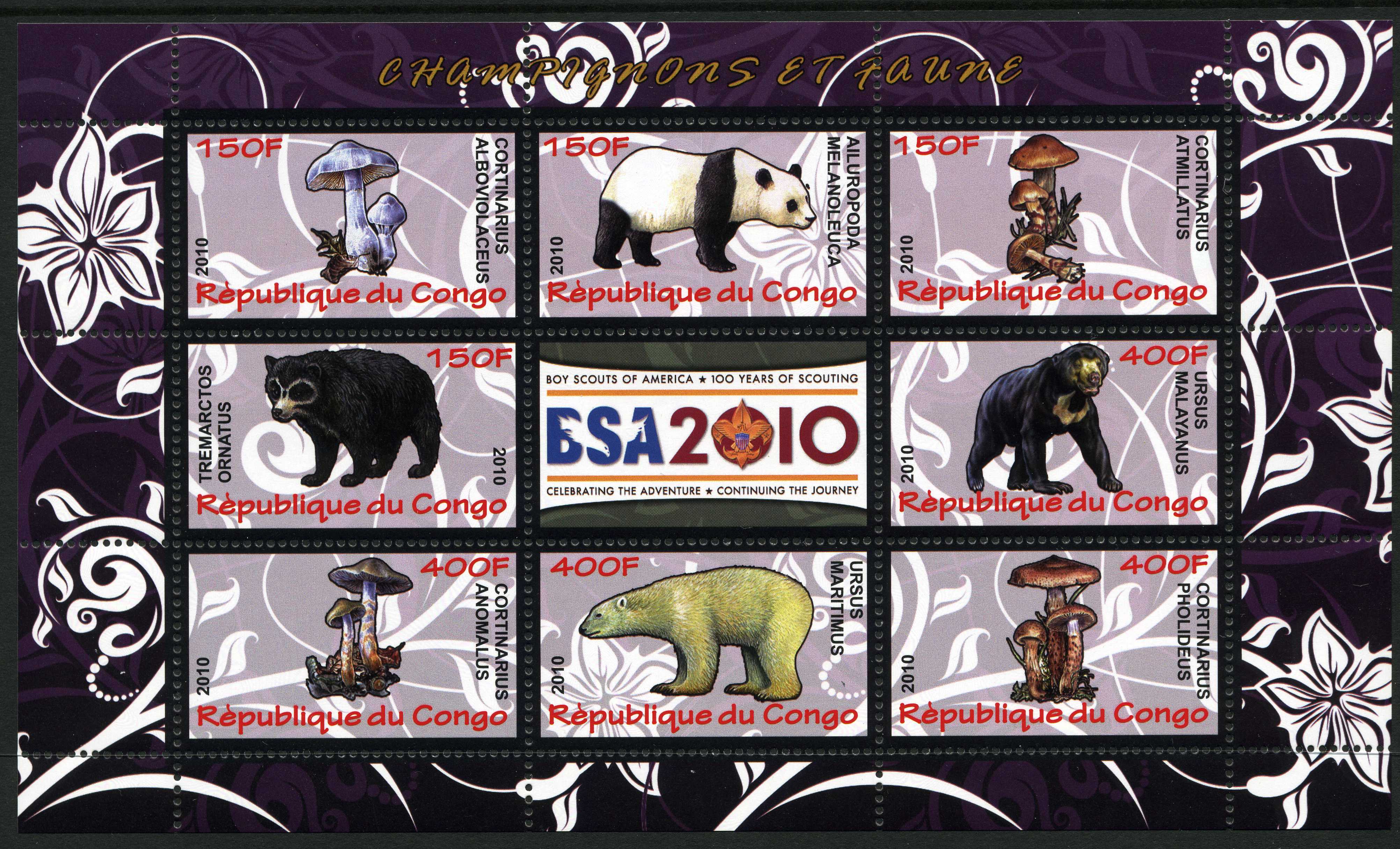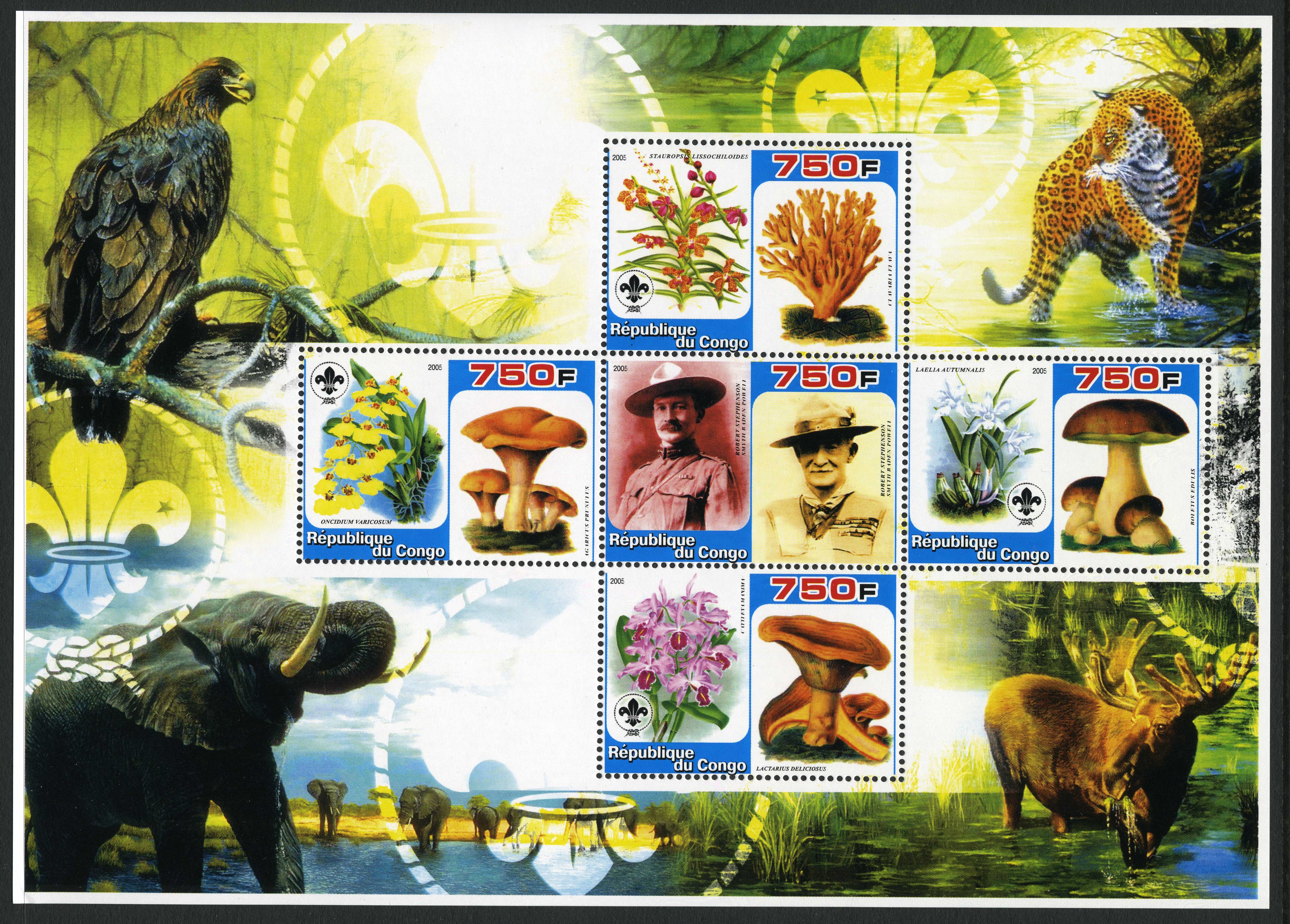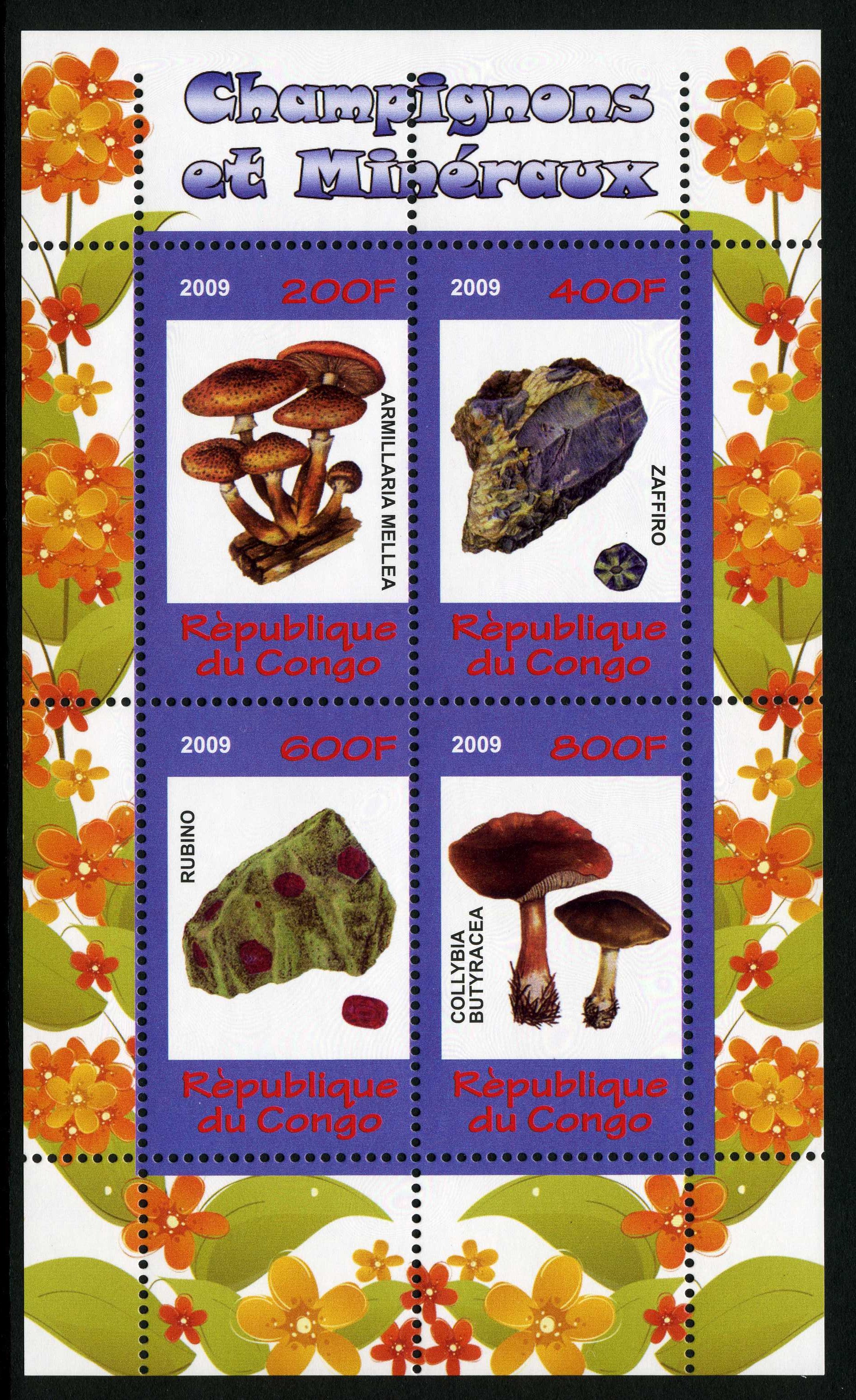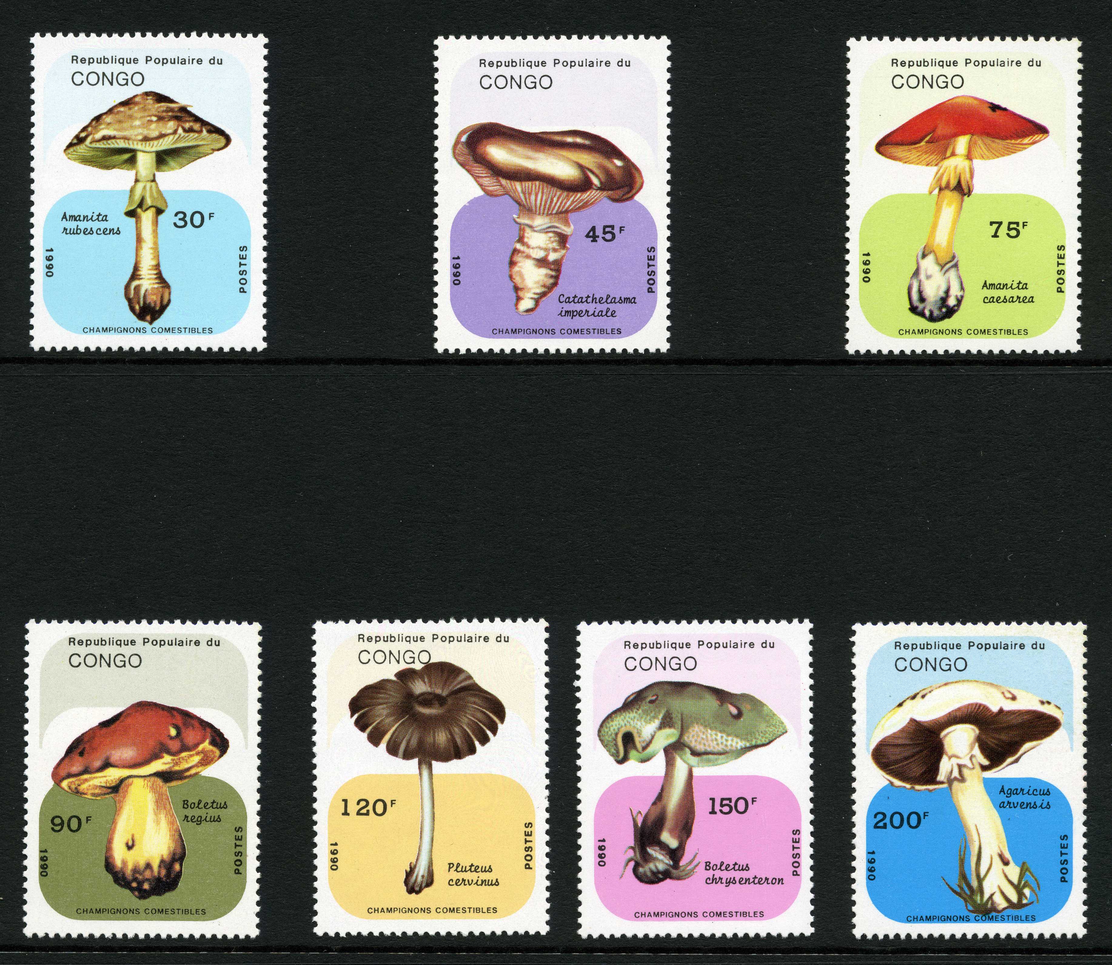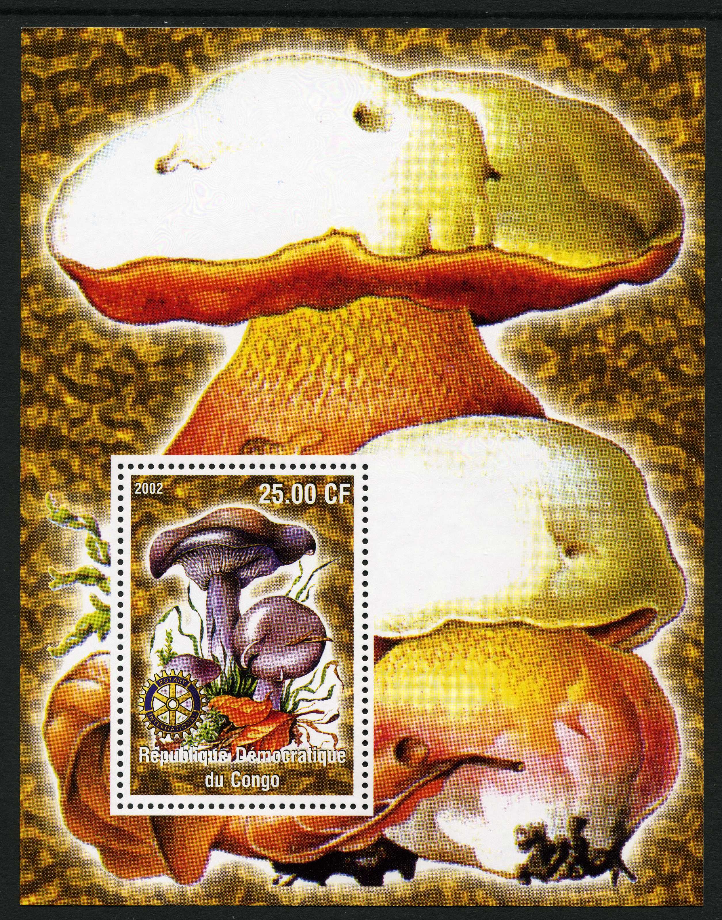 SEPARATES; four stamps all at 960FC face value: Agaricus arvensis, Amanita rubescens, Crucibulum vulgare, Amanita rubescens var. congolensis (as Rubescens congolensis). All four stamps perforated [VIEW], PLUS all four as separates IMPERFORATE [VIEW]. PLUS all four stamps together in a minisheet, 114 x 80 mm, which is IMPERFORATE [VIEW]. | |