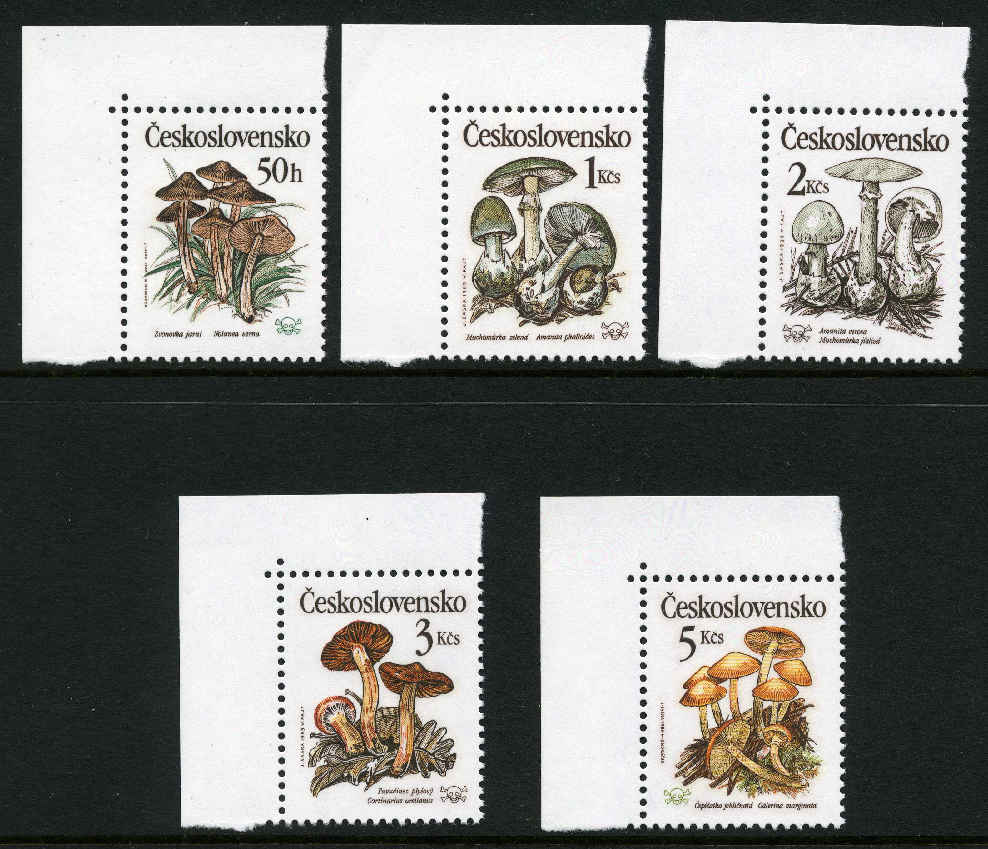 Uncatalogued FDC, featuring 1, 2 & 3 kcs stamps from the series listed immediately above, envelope decorated with line-drawing of Amanita (muscaria?); stamps cancelled with decorative mushroom mark "Praha 5-9-1989" | VIEW |