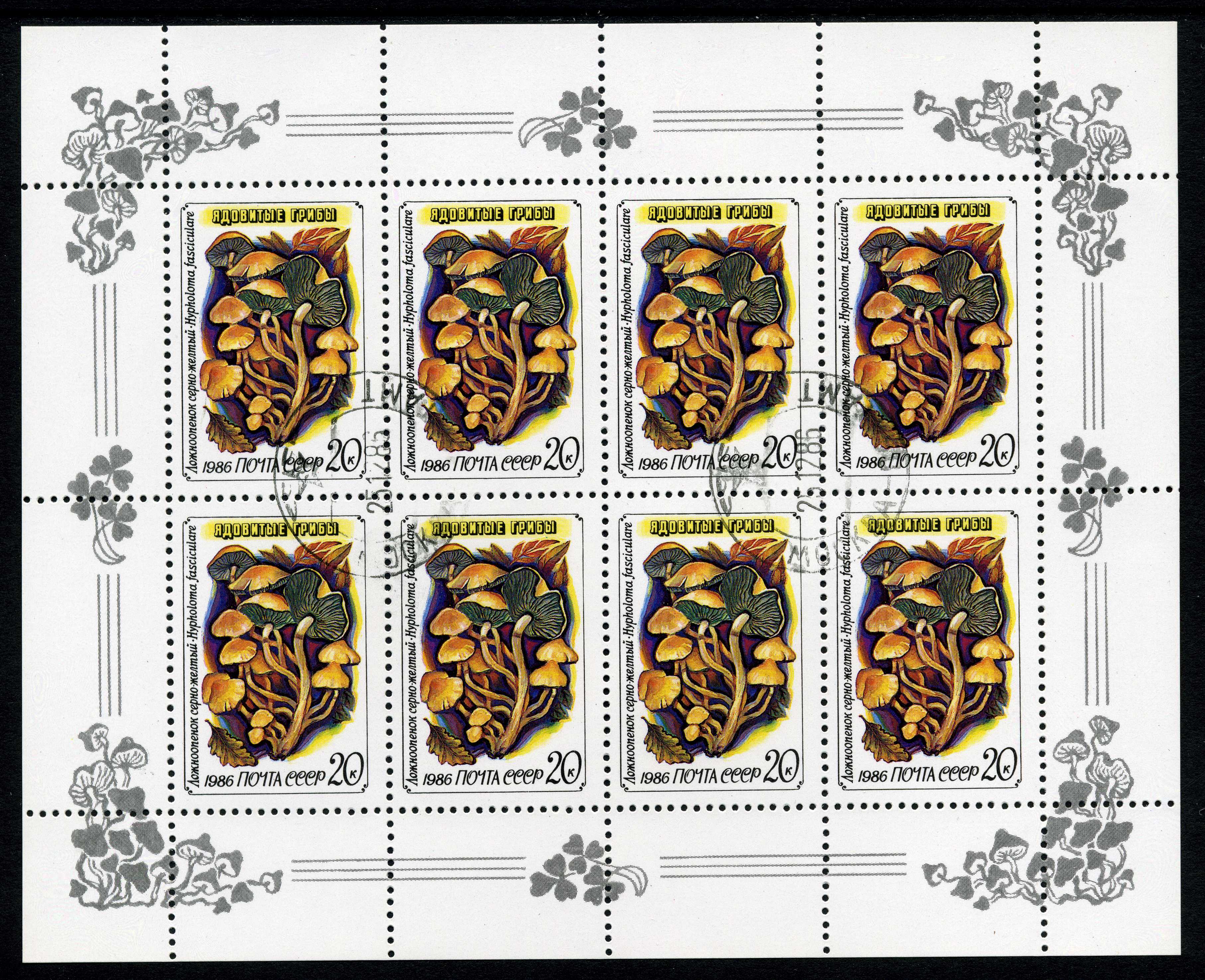 | Russia (Soviet) | 1986 | 5655 | Hypholoma fasciculare, Clustered woodlover; Eight copies of the stamp in a 4 x 2 minisheet with decorative edging. Cancelled, Moscow 25 12 1986. | VIEW |