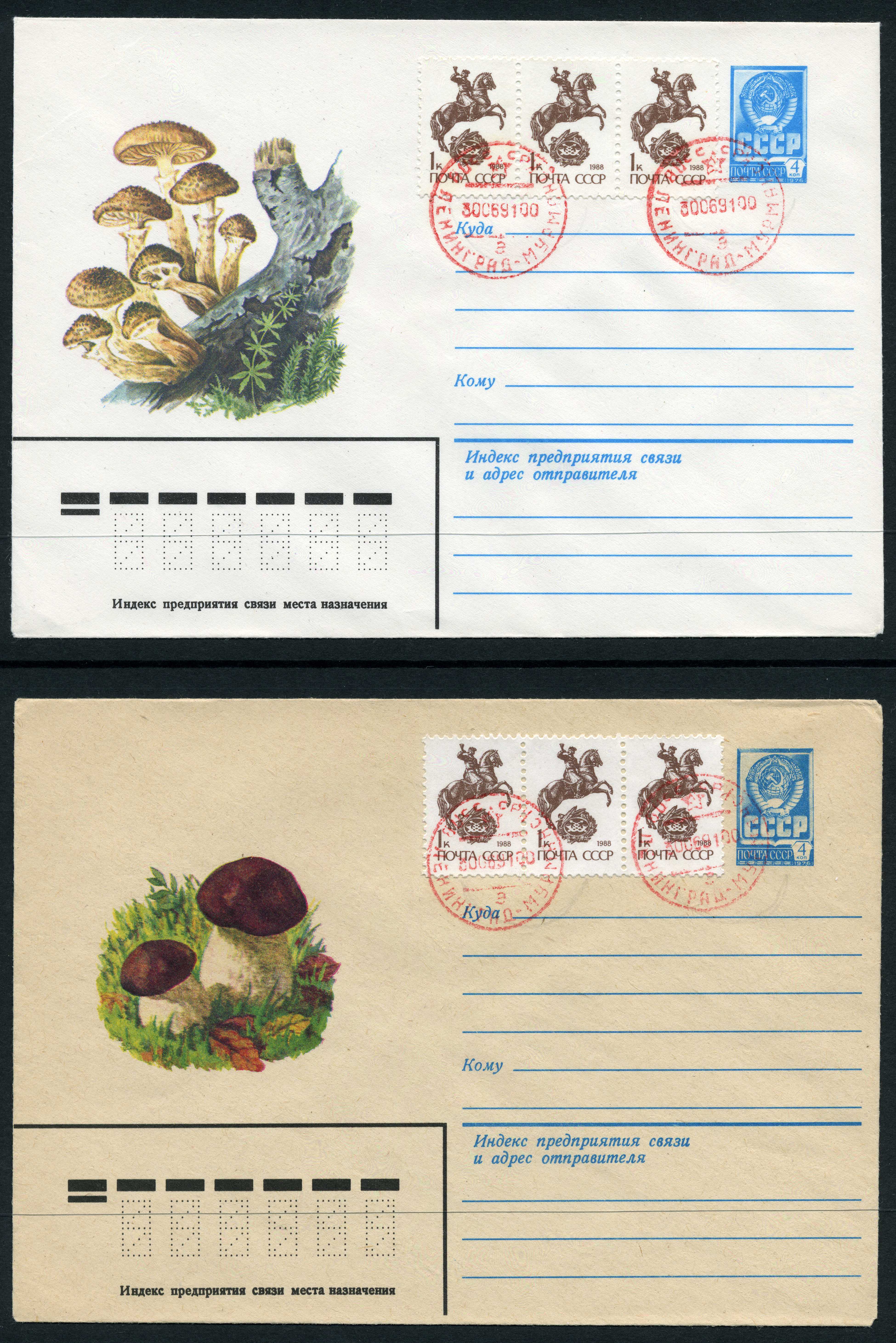 | Russia (Soviet) | 1988 | 6072 | Brown precancelled stamps on multicoloured mushroom stationery; set of 10 envelopes. [VIEW 1], [VIEW 2], [VIEW 3], [VIEW 4], [VIEW 5]. | |