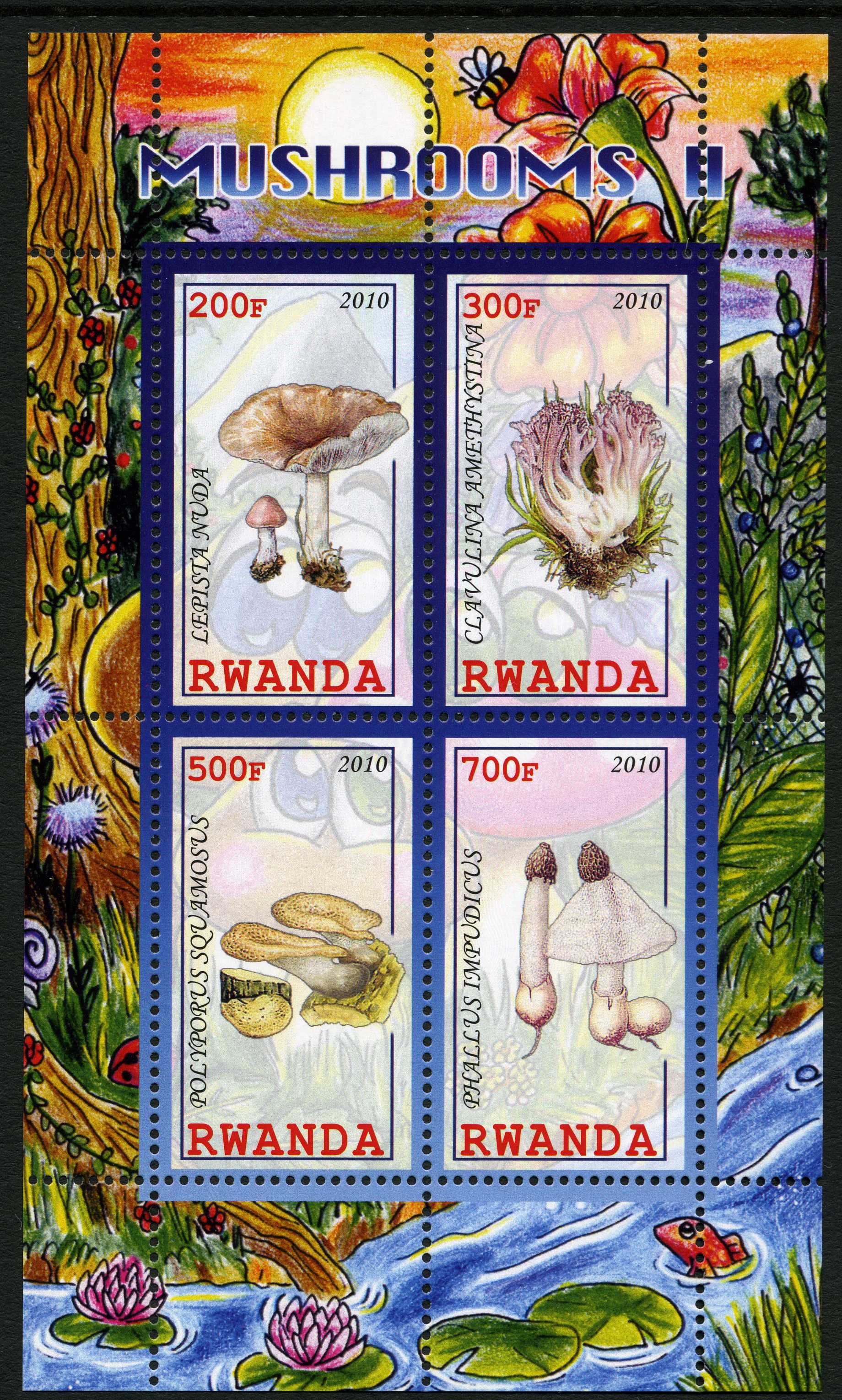 | Rwanda | 2010 | DM2010 | Minisheets, 75 x 126 mm, of four stamps, all vert., (a) 200F, Amanita muscaria; 300F, Amanita pantherina; 500F, Amanita spissa; 700F, Lepiota acutesquamosa [VIEW]; (b) 200F, Lepista nuda; 300F, Clavulina amethystina; 500F, Polyporus squamosus; 700F, Phallus impudicus [VIEW]. | |
