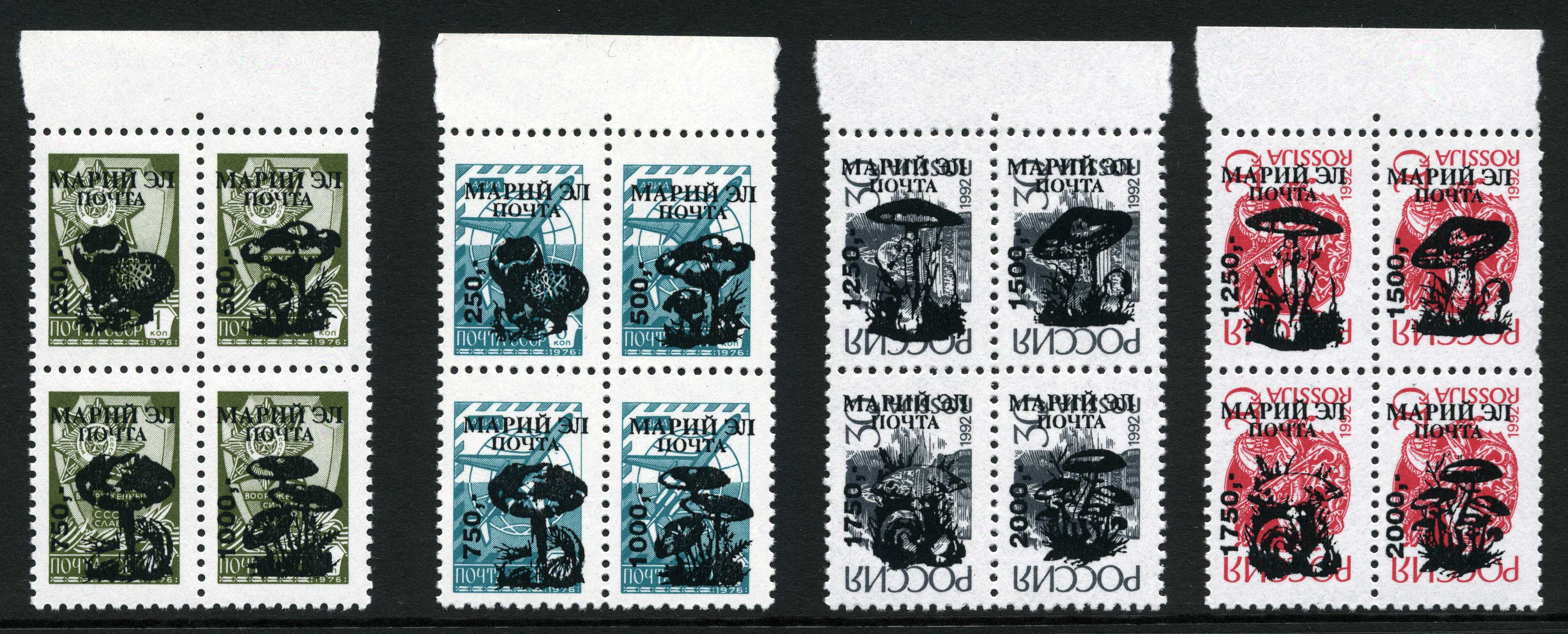 | Russian Federation Mari-El | 1996 | DM1996 | Blocks of four old Soviet stamps each individual stamp overprinted (in black) with a drawing of a mushroom and a new face value: (a) 250, 500, 750 and 1000 overprinted onto green 1 kopec stamps of 1976; (b) same designs and values overprinted on blue 6 k stamps of 1976; (c) 1250, 1500, 1750 and 2000 with a different set of mushroom images overprinted onto grey 30 k stamps of 1992; (d) same designs and values overprinted on red 20k stamps. of 1992. | VIEW |