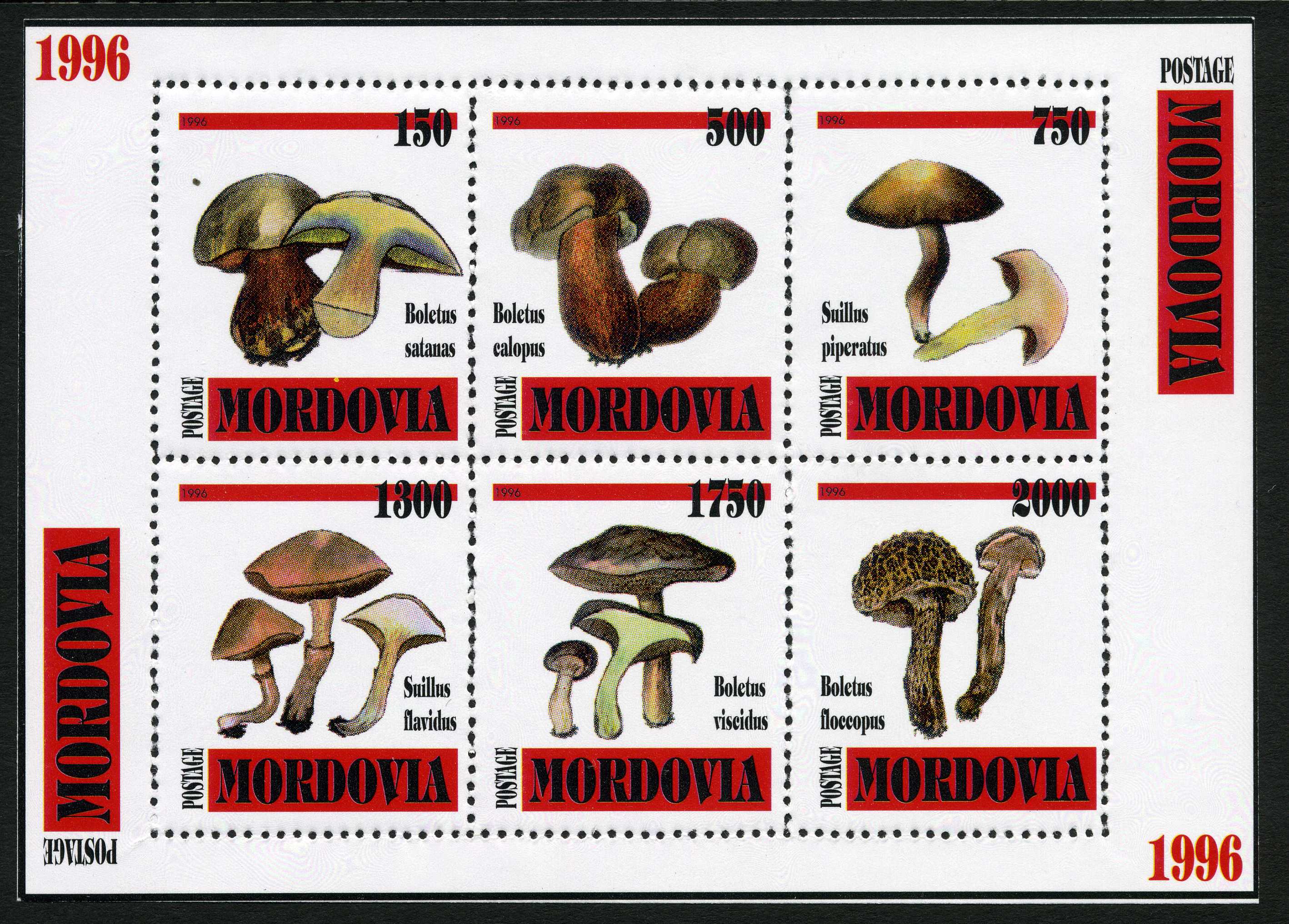 | Russian Federation Mordovia | 1999 | DM1999 | Sheet, 168 x 77 mm, of six horiz. stamps; 2.00, Russula emetica; 3.00, Russula caerulea; 4.00, Boletus pruinatus; 5.00, Boletus piperatus; 6.00, Boletus versicolor; 7.00, Boletus luridus. | VIEW |