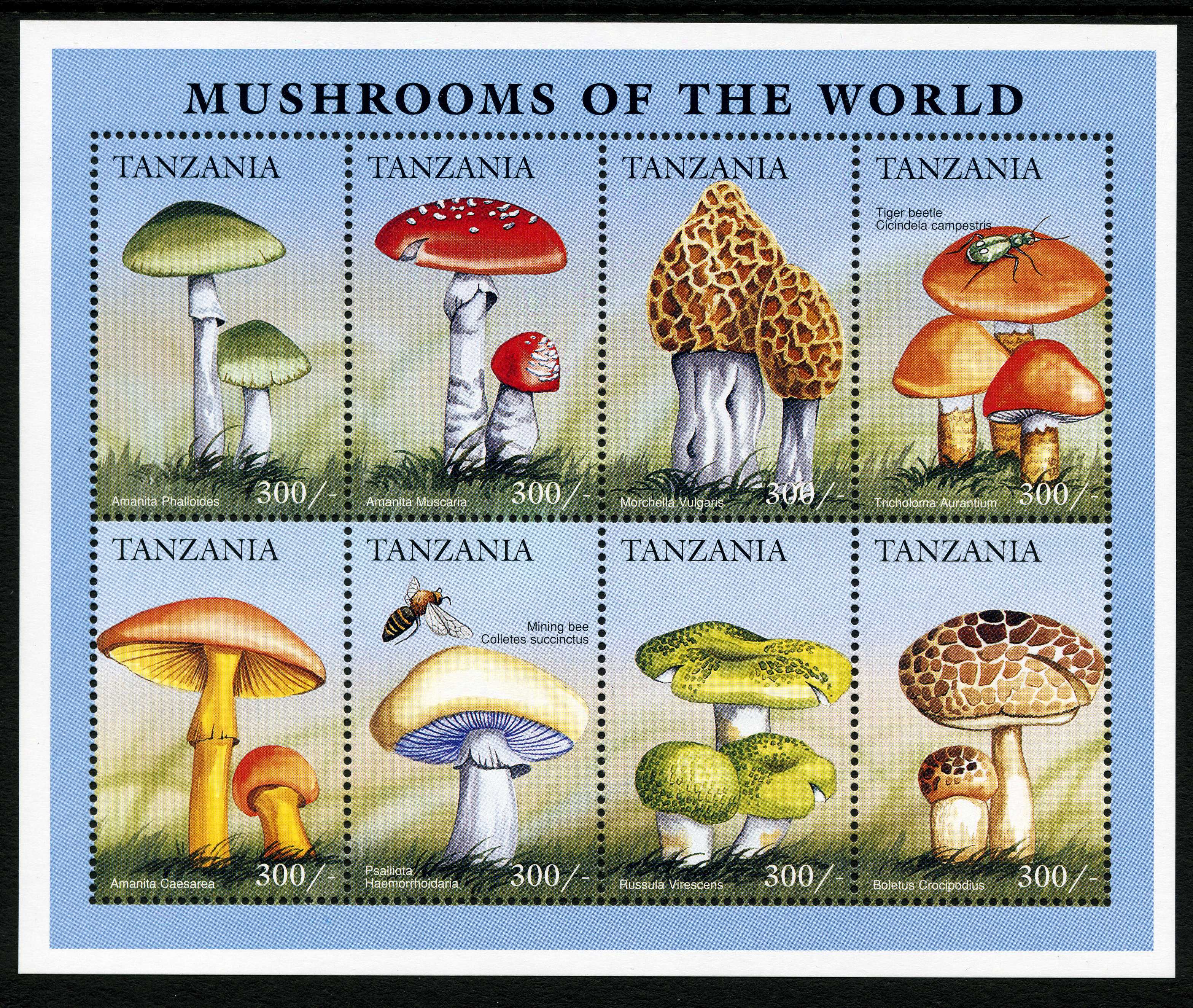 | Tanzania | 1996 | DM1996 | Sheet, 130 x 106 mm, of eight stamps, all 300 shillings face value, all vert.; (a) Coprinus comatus, Amanitopsis vaginata, Clitocybe geotropa, Cortinartius violaceus, Russula sardonia, Cortinarius colinitus, Boletus aereus, Macrolepiota procera [VIEW]; (b) Amanita phalloides, Amanita muscaria, Morchella vulgaris, Tricholoma aurantium, Amanita caesarea, Psalliota haemorrhoidaria, Russula virescens, Boletus crocipodius [VIEW]. PLUS minisheets, both 1000 shillings face value: (a) 106 x 87 mm, Collybia distorta [VIEW]; (b) 87 x 106 mm, Ganoderma lucidum [VIEW]. | |