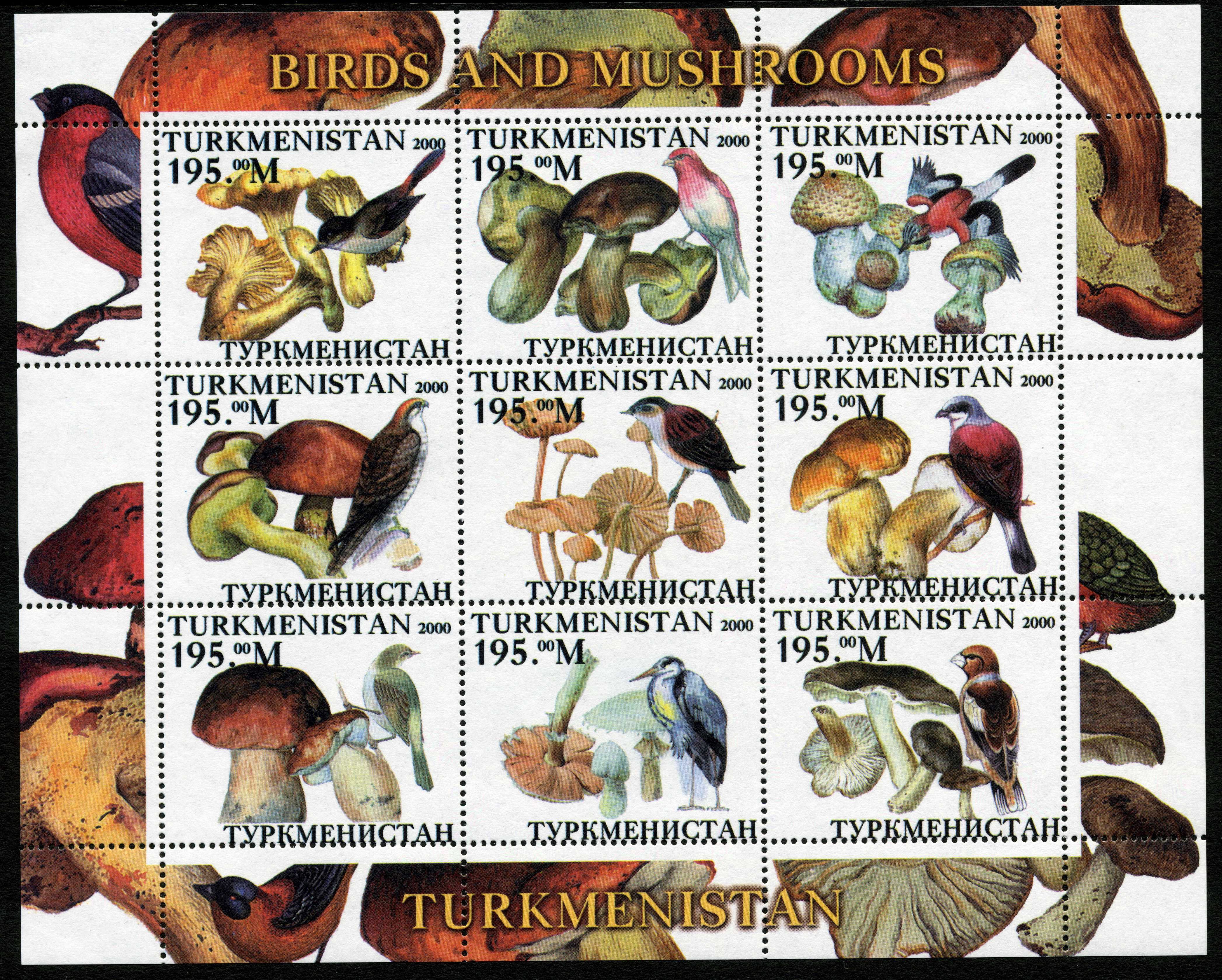 | Turkmenistan | 2000 | DM2000 | Collective sheet, 174 x 140 mm, nine stamps in the series 'Birds and Mushrooms', 3 x 3, all horiz., all 195.00M face value. Each showing an unidentified mushroom and an unidentified bird. | VIEW |
